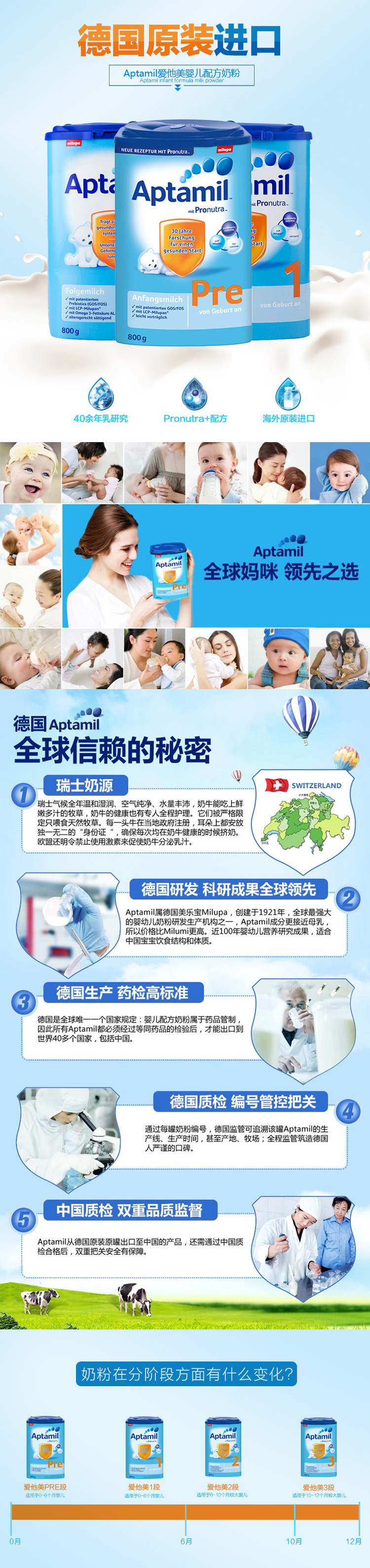 产品特点:德国爱他美Aptamil奶粉pre段/1段/2段/3段 800g