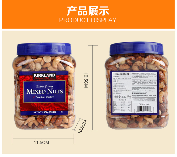 产品特点:美国原装Kirkland柯可蓝盐焗混合坚果果仁1130g